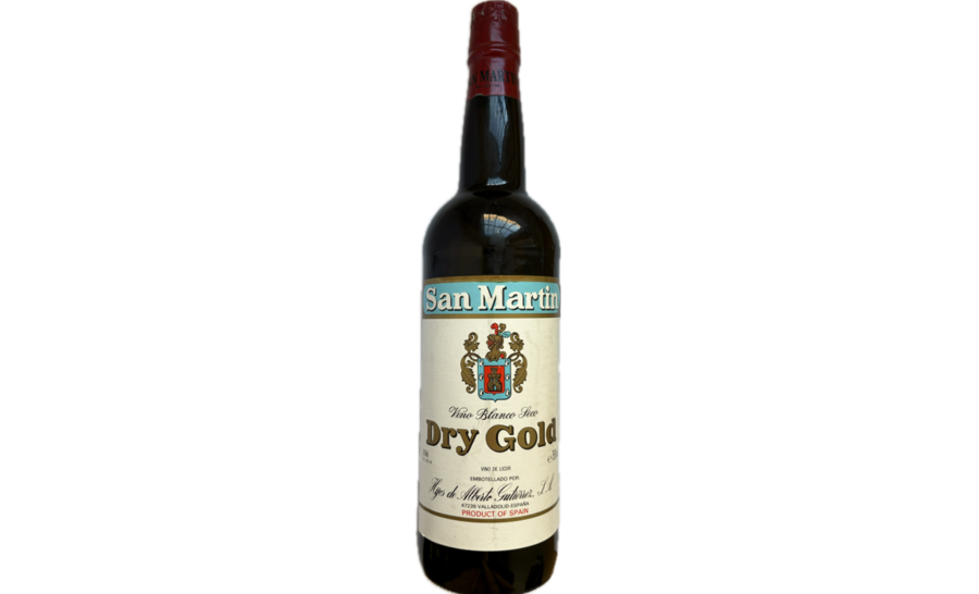Las conexiones entre Rueda y los vinos andaluces son constantes. Solo hay que ver embotellados como el San Martín Dry Gold (imagen inferior), con 17% vol., que pasaría fácilmente por un vino del sur. Esta marca se elaboraba también como vino Añejo. El nombre aludía tanto a un pago de Serrada como a una imagen del santo declarada bien de interés cultural que se encuentra en la iglesia parroquial de San Pedro en Serrada.