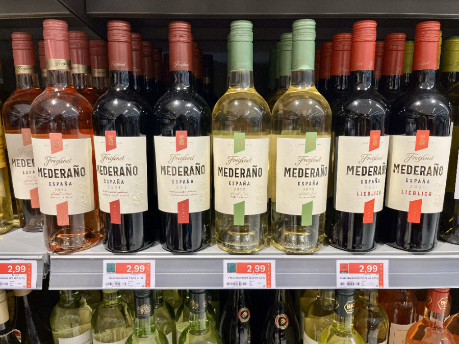 Los graneles españoles también se destinan a vinos tranquilos de venta en supermercados bajo los indicativos Vino de España o Vino de la Tierra de Castilla. Entre las marcas líderes de esta categoría se encuentran Mederaño y Mia, con más de 10 y cuatro millones de botellas anuales respectivamente. Propiedad de Freixenet, ambas se embotellan en Wiesbaden a través de su filial Freixenet Vinos GmbH. Los precios de venta al público de estos y otros vinos tranquilos españoles embotellados por empresas alemanas como Peter Mertes y Rheinberg Kellerei oscilan entre 1,99 € y 4,99 €. A menudo son vinos semisecos, adaptados al gusto del consumidor alemán medio.