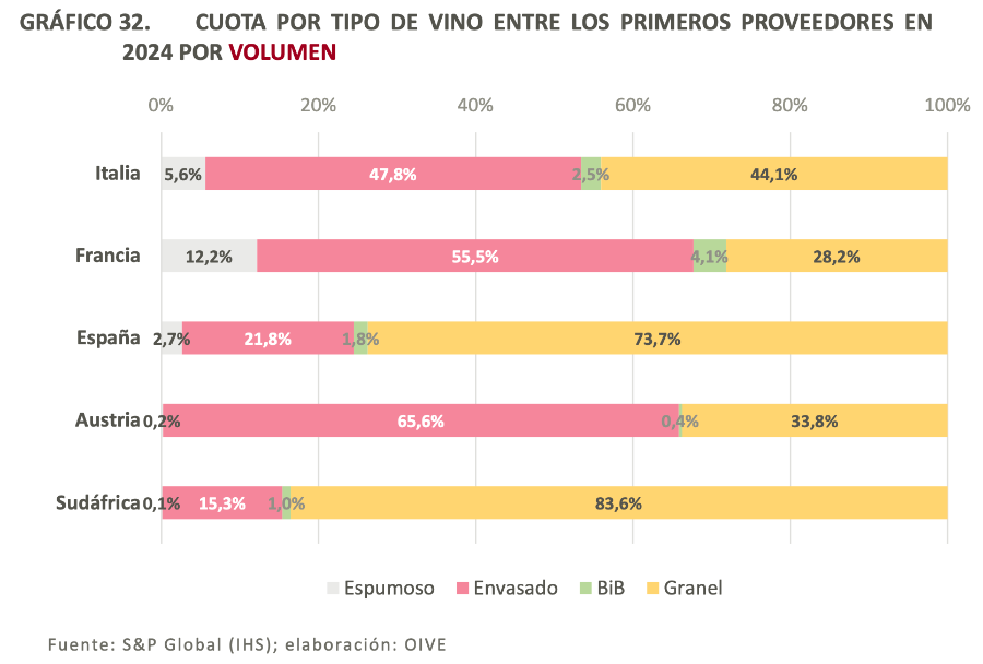 El principal proveedor es Castilla-La Mancha. Según la OIVE (Organización Interprofesional del Vino de España), las exportaciones de vino de esta comunidad a Alemania se multiplicaron por seis, pasando de 51 millones de litros en 2000 a 308 millones en 2023; de estos, 219 millones fueron graneles blancos. El grueso de esta partida son vinos de airén, la omnipresente variedad blanca manchega que sirve de base a la industria alemana de espumosos y, en menor medida, alimenta la producción de los Glühwein, vinos blancos especiados que se sirven calientes y son típicos de los mercadillos navideños. Teniendo en cuenta que Alemania produce unos 180 millones de litros de riesling al año, es probable que sus habitantes beban más airén que su variedad blanca más representativa.