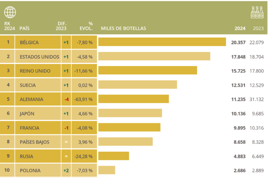 Controlada desde 2018 por el grupo alemán Henkell, Freixenet es la marca de espumoso español más vendida en Alemania. Debido a la escasez de uva y vino base provocada por la persistente sequía que afectó a Cataluña entre 2021 y 2023, la compañía empezó a utilizar uvas del centro de España, fundamentalmente macabeo y chardonnay, y en agosto de 2024 lanzó Freixenet Premium Cuvée de España, dentro de la gama Carta Nevada, en Alemania, Austria y Suiza. Este nuevo espumoso ya no se puede etiquetar como Cava porque utiliza uvas de fuera de la zona de producción de la DO y abandona el método tradicional para elaborarse en grandes depósitos. Como consecuencia de esta decisión, las exportaciones de la DO Cava a Alemania cayeron un 64% (ver cuadro inferior), pasando de 31,1 millones de botellas en 2023 a 11,2 millones en 2024. Este descenso pone de manifiesto la dependencia de la DO Cava de un puñado de grandes productores.