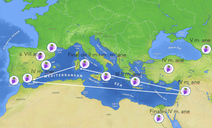 Gaston Hochar, director general de Château Musar (Líbano) intentó trazar los vínculos vinícolas entre las antiguas civilizaciones del Mediterráneo mediante una cronología que arrancó en el 6000 a. C., cuando la agricultura hizo que las comunidades se convirtieran a la vida sedentaria, domesticaran la vid y realizaran sus primeras elaboraciones. De esa fecha data el hallazgo de un ánfora en Mesopotamia con restos de tartárico y resina, lo que implica ya una voluntad de conservación del vino. Lo que fascina a Hochar es el hallazgo, 3.000 años después, de restos similares en una tumba en Abidos, 500 kilómetros al sur de El Cairo (Egipto), pero en ánforas fenicias, de la actual zona de Israel, Palestina, Siria, Líbano. Este descubrimiento prueba el comercio del vino entre fenicios y egipcios antes de que estos últimos comenzaran a plantar sus propias viñas y vinos. Biblos (actual Líbano), de hecho, fue durante varios siglos un gran puerto comercial del Mediterráneo. Numerosas fuentes documentales posteriores dan fe del conocimiento de vinos de distintos orígenes elaborados en el Mediterráneo y el comercio que se establecía a través de sus distintos puertos.