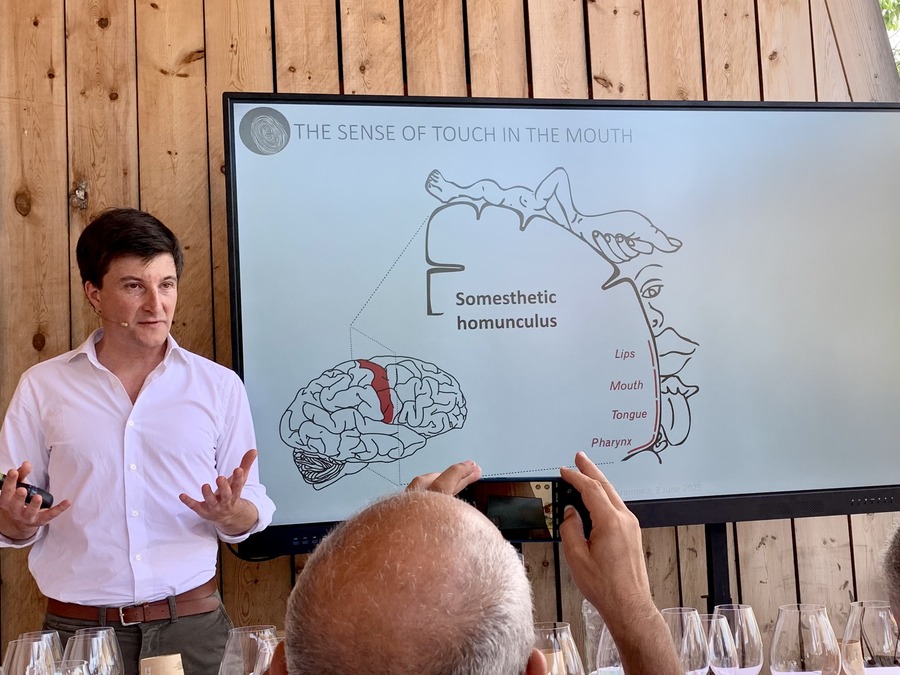 For Gabriel Lepousez, a neuroscientist specialising in wine-related sensory perception at the Pasteur Institute, geosensory tasting offers a new vocabulary. “Before the 1970s, there were hardly any aromatic descriptors. Today, 80% of the language of wine is aroma-based, with only 20% relating to other sensations. It would be interesting to redress the balance and embrace a more inclusive form of tasting,” he said. Lepousez presented some strong arguments, including the fact that around 20-25% of our tactile perception is concentrated in the mouth. He also emphasised salivation — humans produce a litre of saliva a day — and how saliva proteins interact with wine compounds to create different textures.