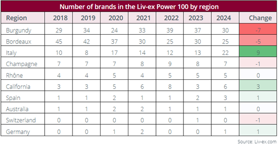 Aside from the strong position of French wines and its most prestigious regions (Burgundy, Bordeaux, Champagne and, to a lesser extent, Rhône), the big star of the 2024 100 Power was Italy. The country had 22 wineries on the list, nine more than in 2023, and held prominent positions, with Gaja in second place and San Guido in third.