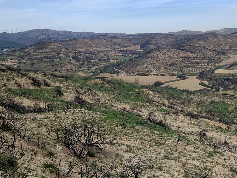 El productor navarro Gonzalo Celayeta, que ejerce también como director técnico de la cooperativa de San Martín de Unx en Navarra, conoce muy bien este defecto que impregna las uvas, y posteriormente el vino, de desagradables notas a ceniza y a quemado. En 2022, ardieron 2.500 hectáreas en este pueblo de la Baja Montaña navarra. Solo se salvaron las viñas, que acabaron dibujando un paisaje de manchas verdes sobre un extenso manto negro calcinado (ver foto inferior). Numerosas partidas de vino quedaron afectadas.