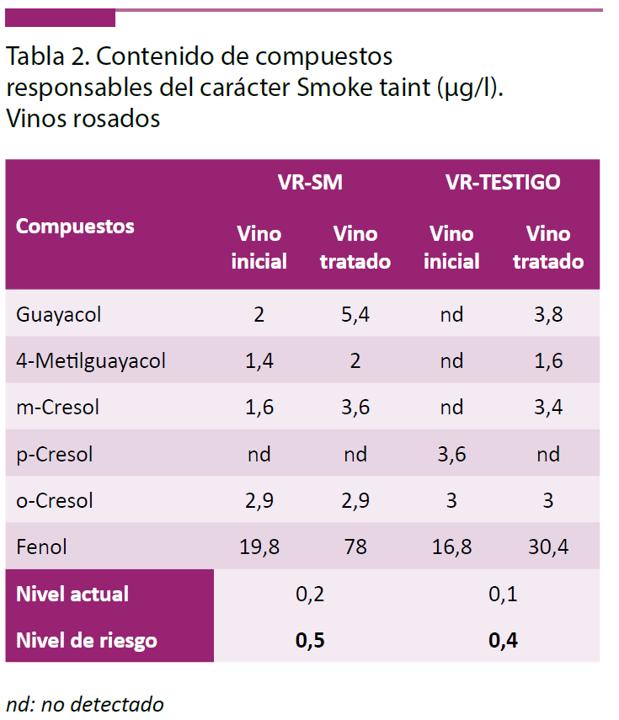 El estudio de Excell Ibérica para Navarra analizó cuatro muestras de tinto y dos de rosado, y en cada caso se incluyó un vino testigo: un rosado de Evena sin afección alguna y un tinto de San Martín de Unx de la cosecha del incendio que no presentaba gusto a humo. La cantidad de compuestos volátiles libres no era indicativa de riesgo, pero tras el tratamiento de hidrólisis, aumentó significativamente en los tintos, incluso en el que no parecía afectado, mientras que en los rosados se mantenía por debajo del nivel aceptable que se establece en el parámetro 1 (ver cuadros).