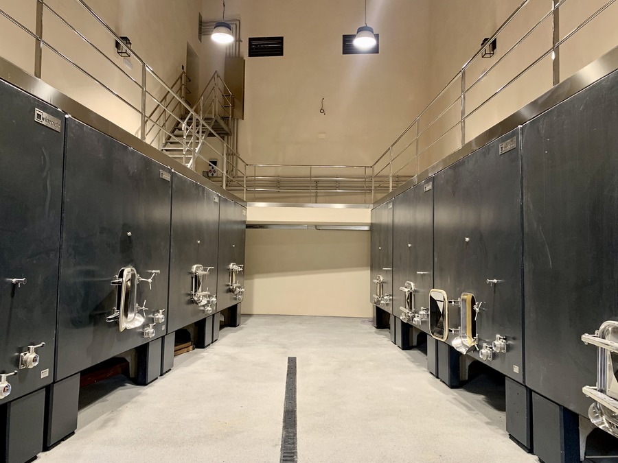 En la elaboración se apuesta por el hormigón, tanto para fermentar como para criar, pero se diferencia entre blancos, a los que se destinan depósitos revestidos, y tintos que se trabajan en cemento en crudo. También se ha habilitado una sala independiente destinada a albergar foudres.
