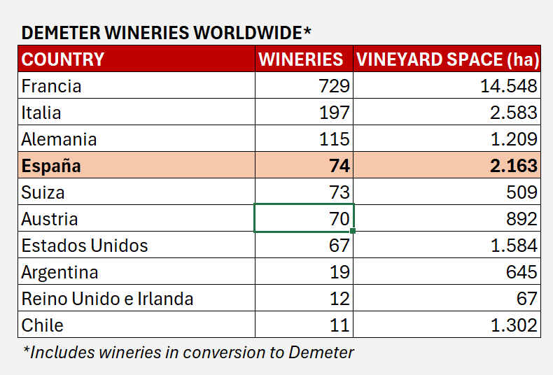 These figures place Spain among the most committed countries. According to the latest comparative study by Demeter International (using slightly different criteria, listing all entities as wineries), Spain ranks third worldwide in vineyard area under biodynamic certification —trailing only France and Italy— and fourth in terms of certified producers, just behind Germany. Among non-European countries, only the US and Chile exceed 1,000 certified hectares, with the latter having far fewer producers.